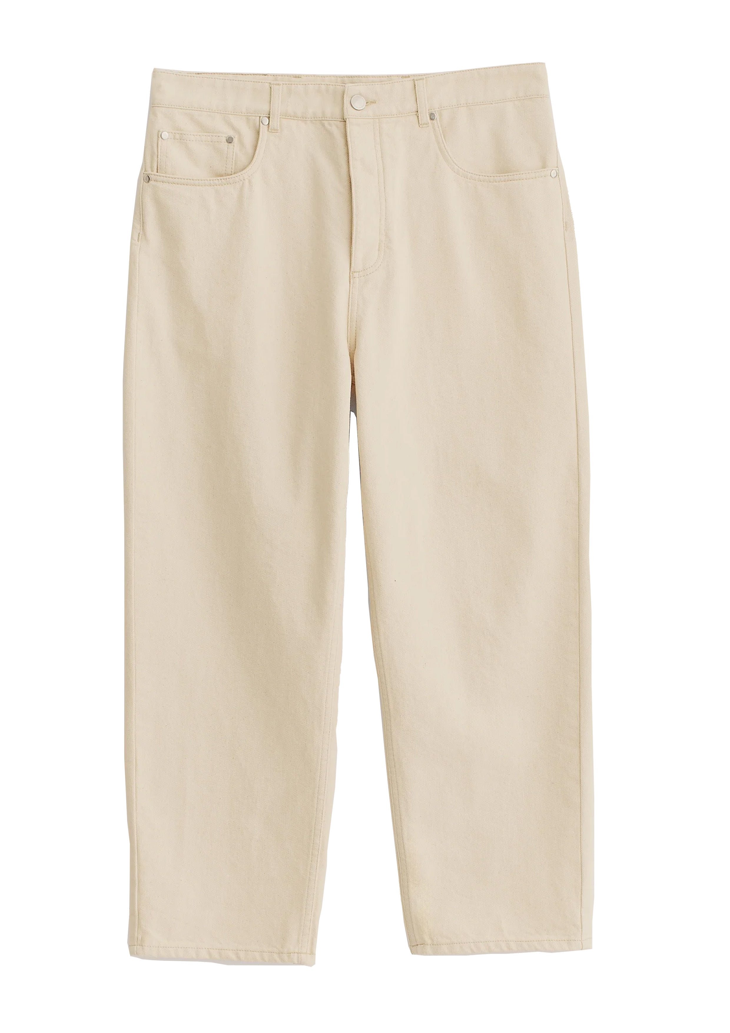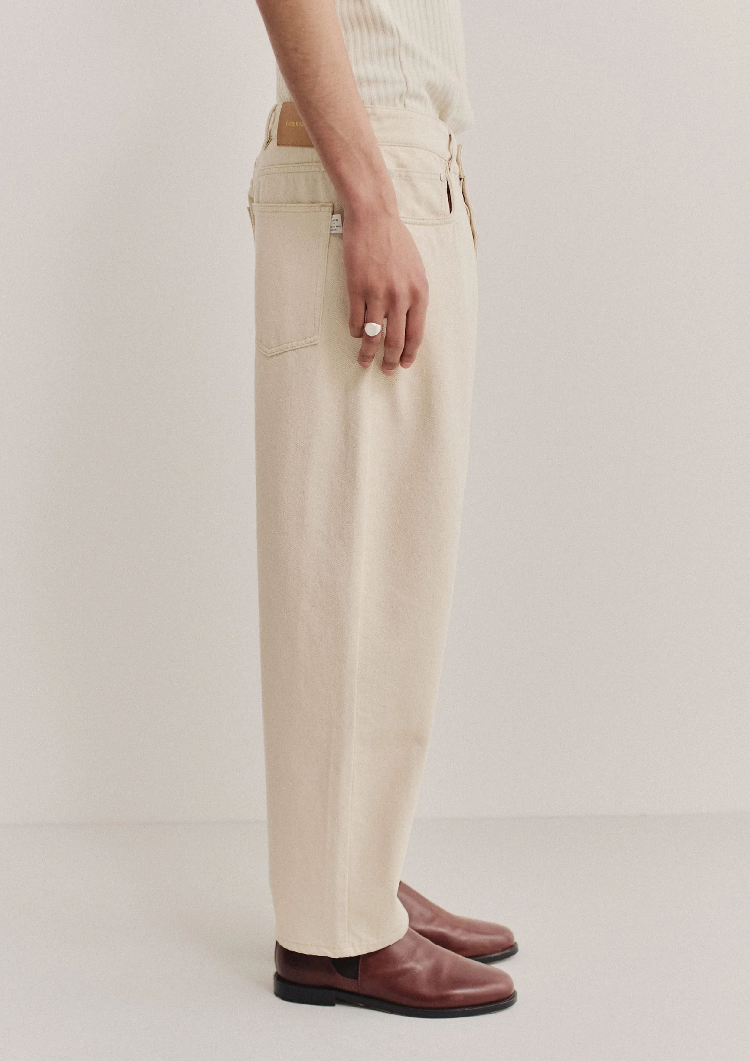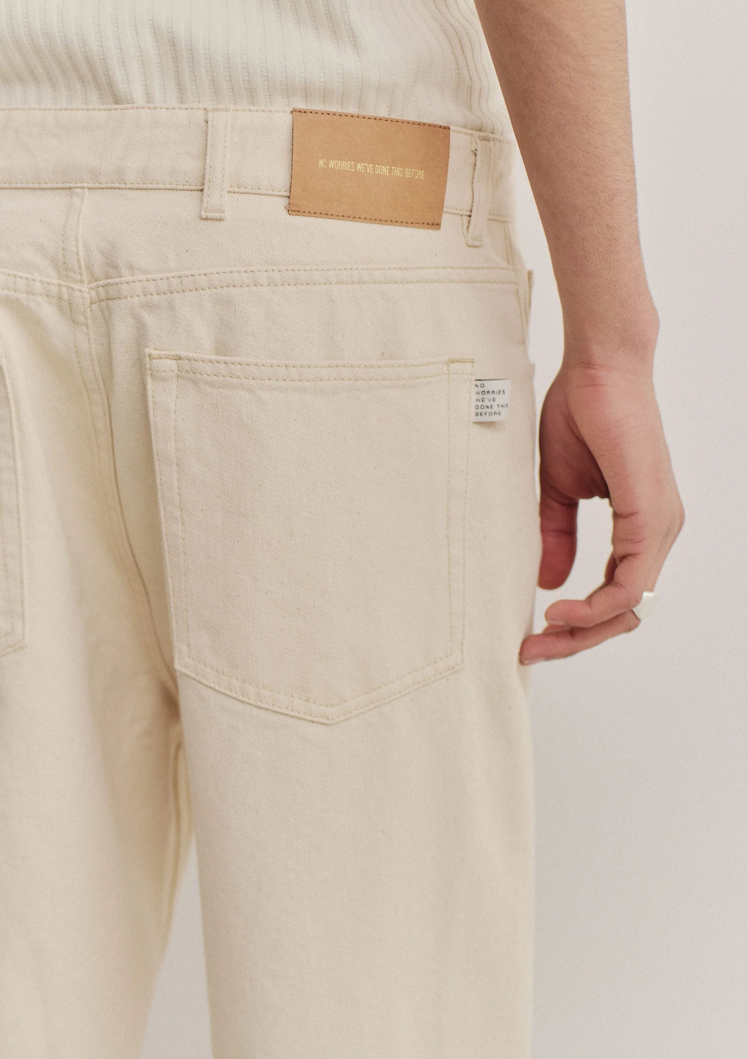 FABRIC: 12 oz raw denim in a soft off-white tone, pre-washed for a creamy touch and relaxed feel. Made from gots-certified organic cotton, woven in Italy.