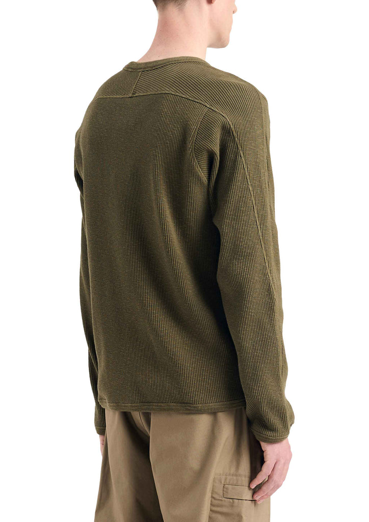 A relaxed fitting sweater inspired by military thermals constructed in a 440 GSM cotton rib jersey. It features a ribbed collar and cuffs, articulated panelling for ease of movement and flatlock stitch detailing.
