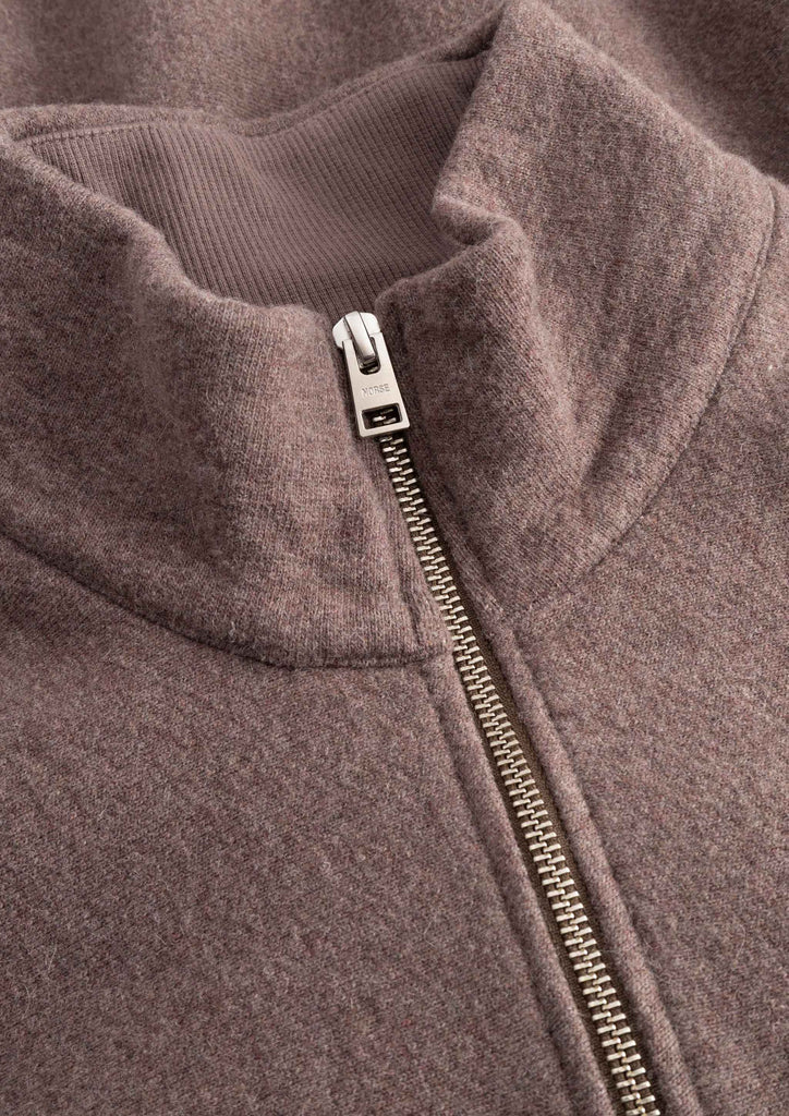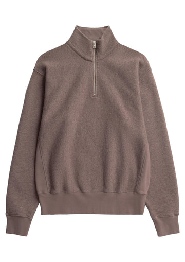 A relaxed fitting half zip funnel neck sweatshirt constructed in a wool and cotton blend quality with a brushed backside. It features rib gussets at the sides, branded metal zipper and ribbed hem and cuffs.