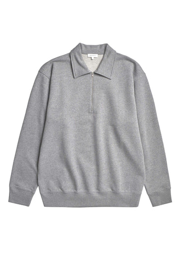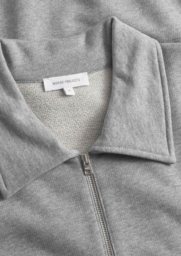 The Norse Standard Half Zip Sweatshirt is made from midweight organic cotton loopback terry, offering a regular fit. It features set-in sleeves, branded metal zipper, ribbed collar, cuffs, and hem and branded tab at the side seam.