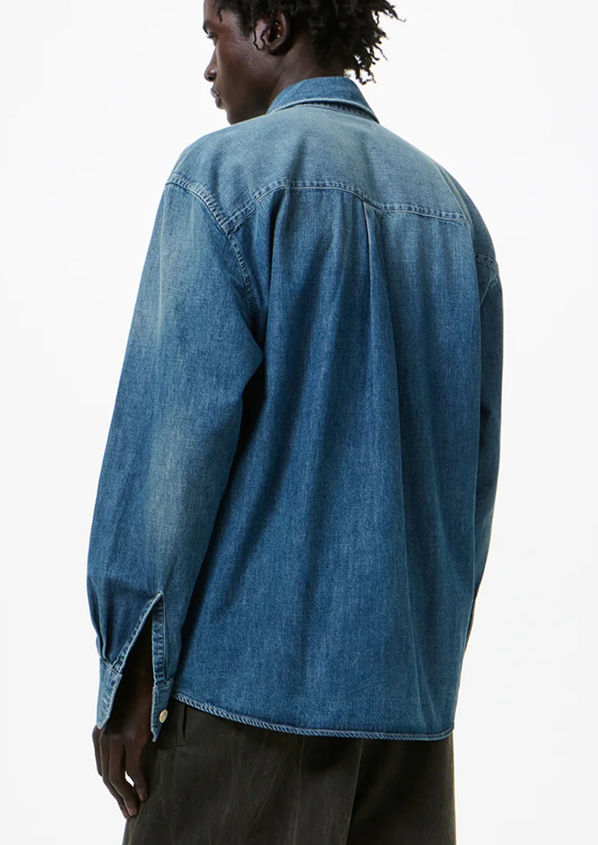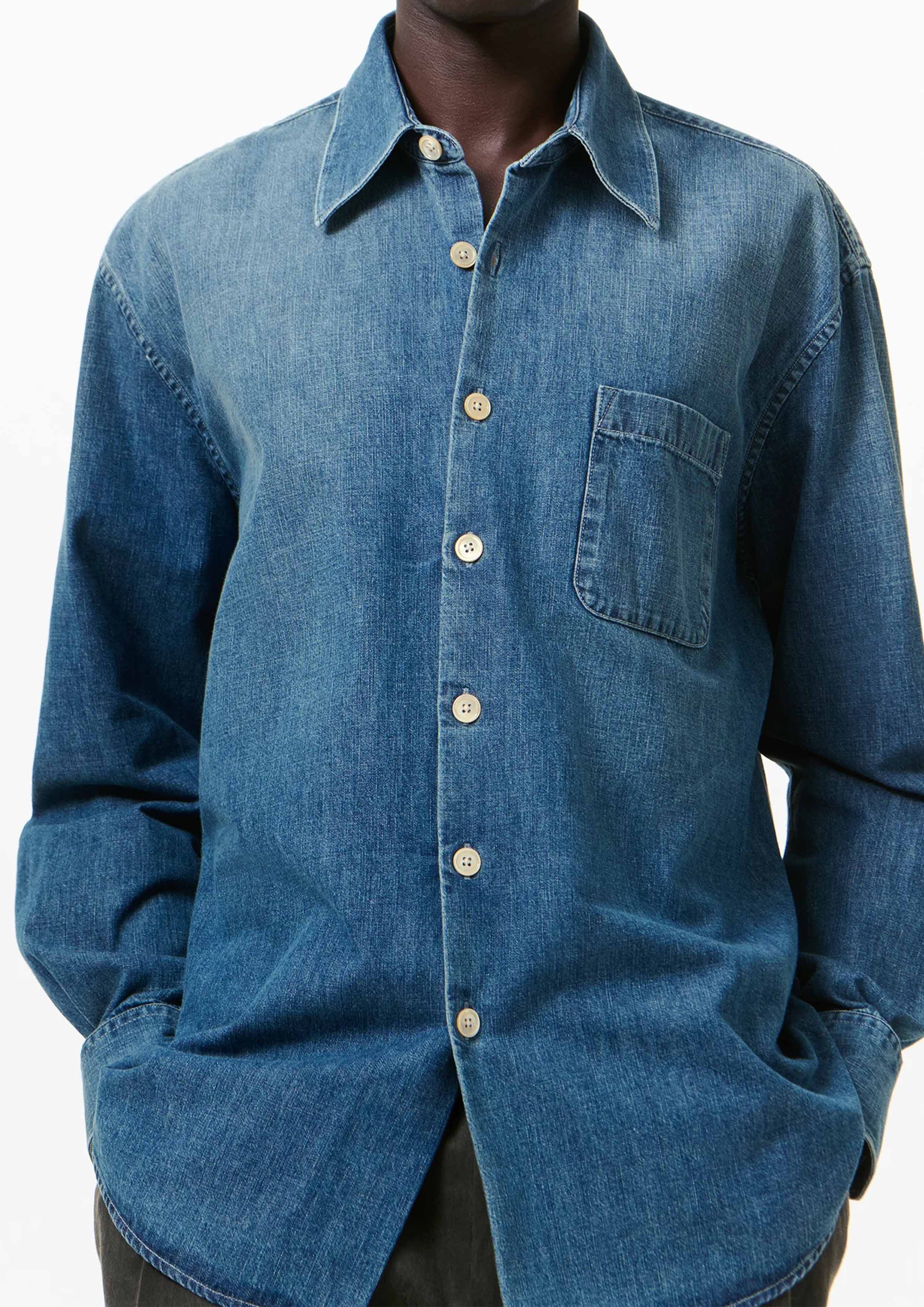Our Above Shirt in Whatever Wash. Produced in an Italian organic cotton fabric with a vintage denim wash, the men's Above Shirt has a slightly oversized cut and features a single chest pocket, mother of pearl buttons, a curved hem and mitered cuffs.