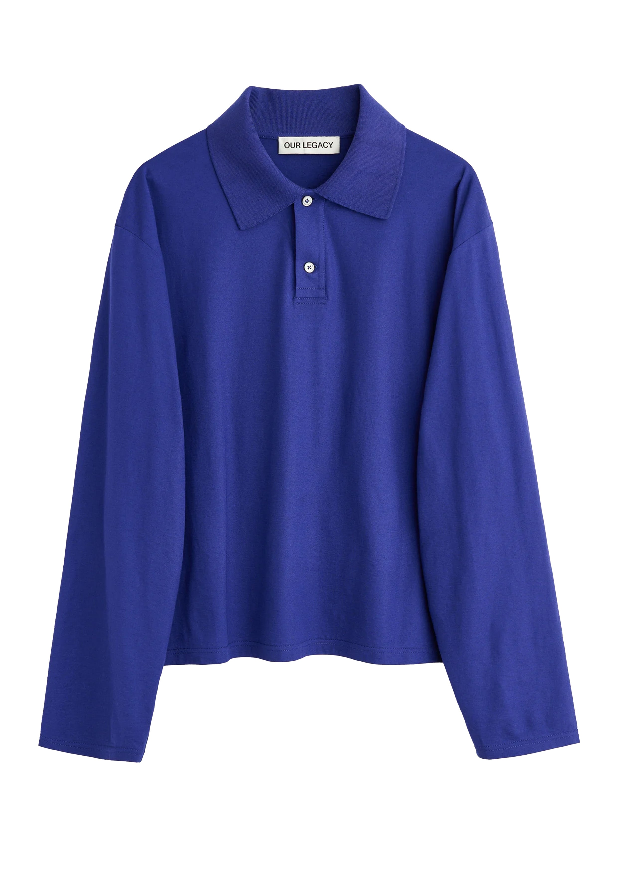 Our Rugby Longsleeve in Deep Blue High Twist Jersey. Produced in a Japanese high-twist cotton jersey, the Rugby Longsleeve has a regular boxy fit with a slightly cropped body and features a two-button pique placket, a knitted rib collar, and mother of pearl buttons. The pigment-dyed collar is intended to fade with washing, developing a contrasting tone against the shell for a vintage look.