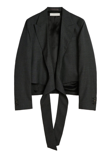 Produced in Italian virgin wool fabric, the women's Wrap Blazer has a straight silhouette with a unique wrap-around closure that can be styled wrapped at the waist or left open for a more casual look. The blazer features peak lapels, a chest pocket, horn buttons, button cuffs with sleeve vents, and is fully lined. Taking inspiration from tailcoat jackets, the back is longer than the front with a side split, combining traditional suiting elements with a contemporary twist.