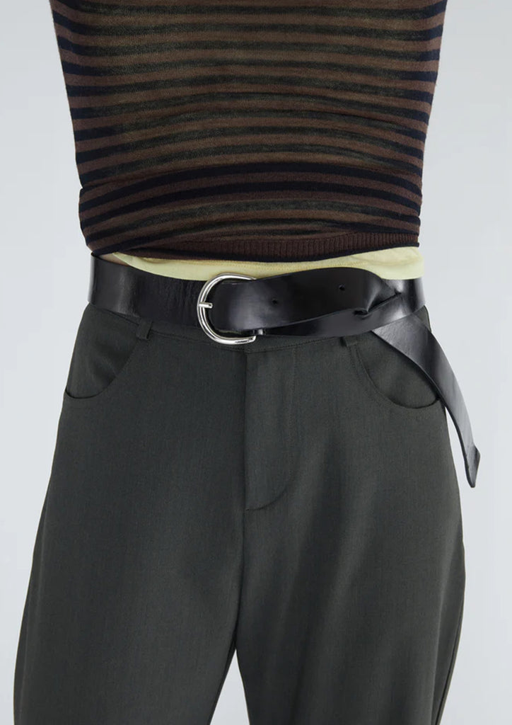 The belt fastens by passing the end through a slit cut into the leather itself.