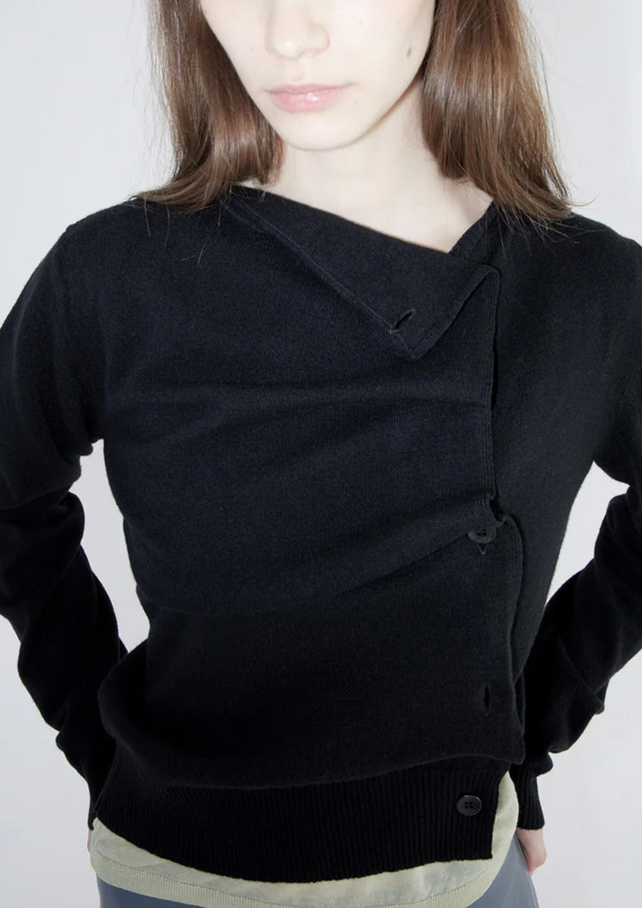 Cardigan with an irregular button fastening. One side is longer than the other, creating folds when buttoned.