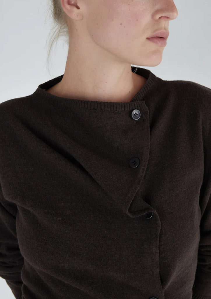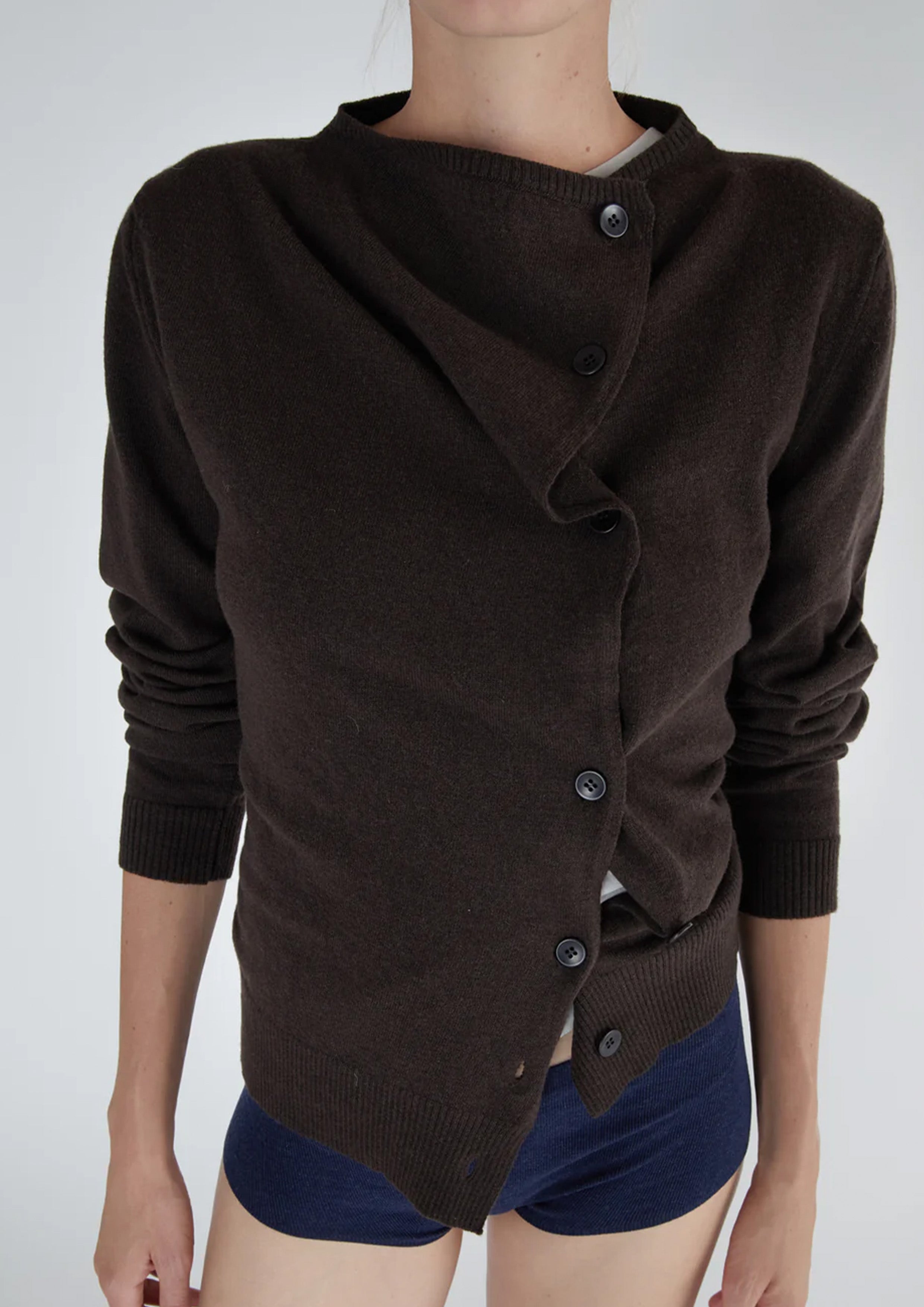 Cardigan with an irregular button fastening. One side is longer than the other, creating folds when buttoned.