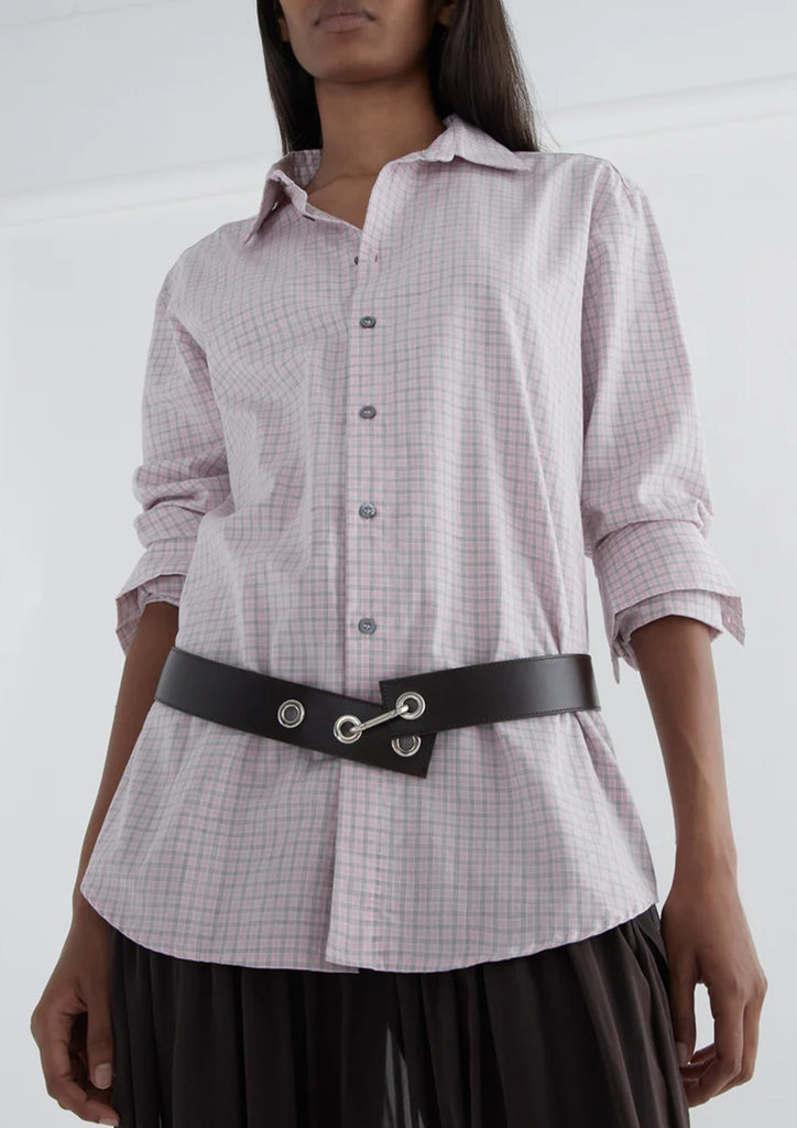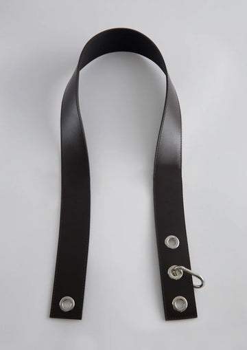 4cm wide belt with reinforcement. It features three nickel metal eyelets for adjustable length and a rectangular carabiner closure.