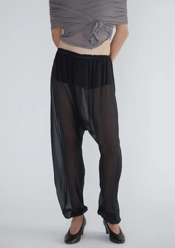 Baggy pants with a slightly ballooned shape at the hem, featuring elastic at both the waist and ankles.