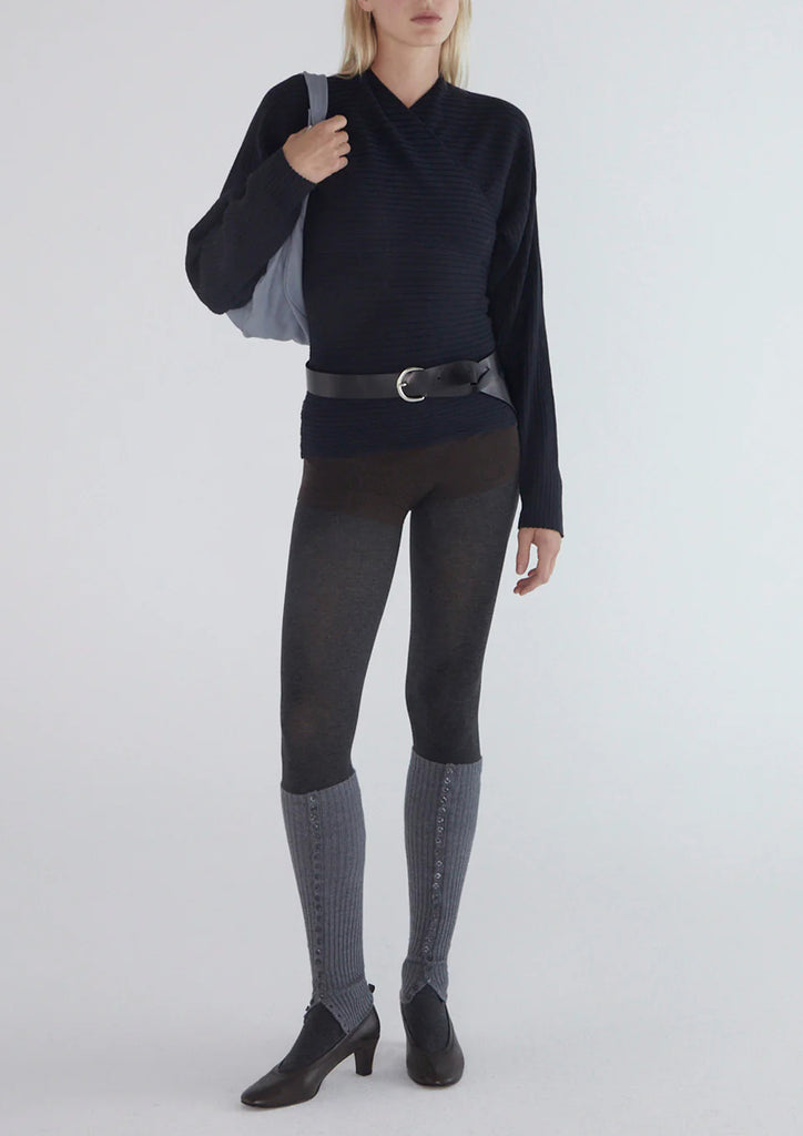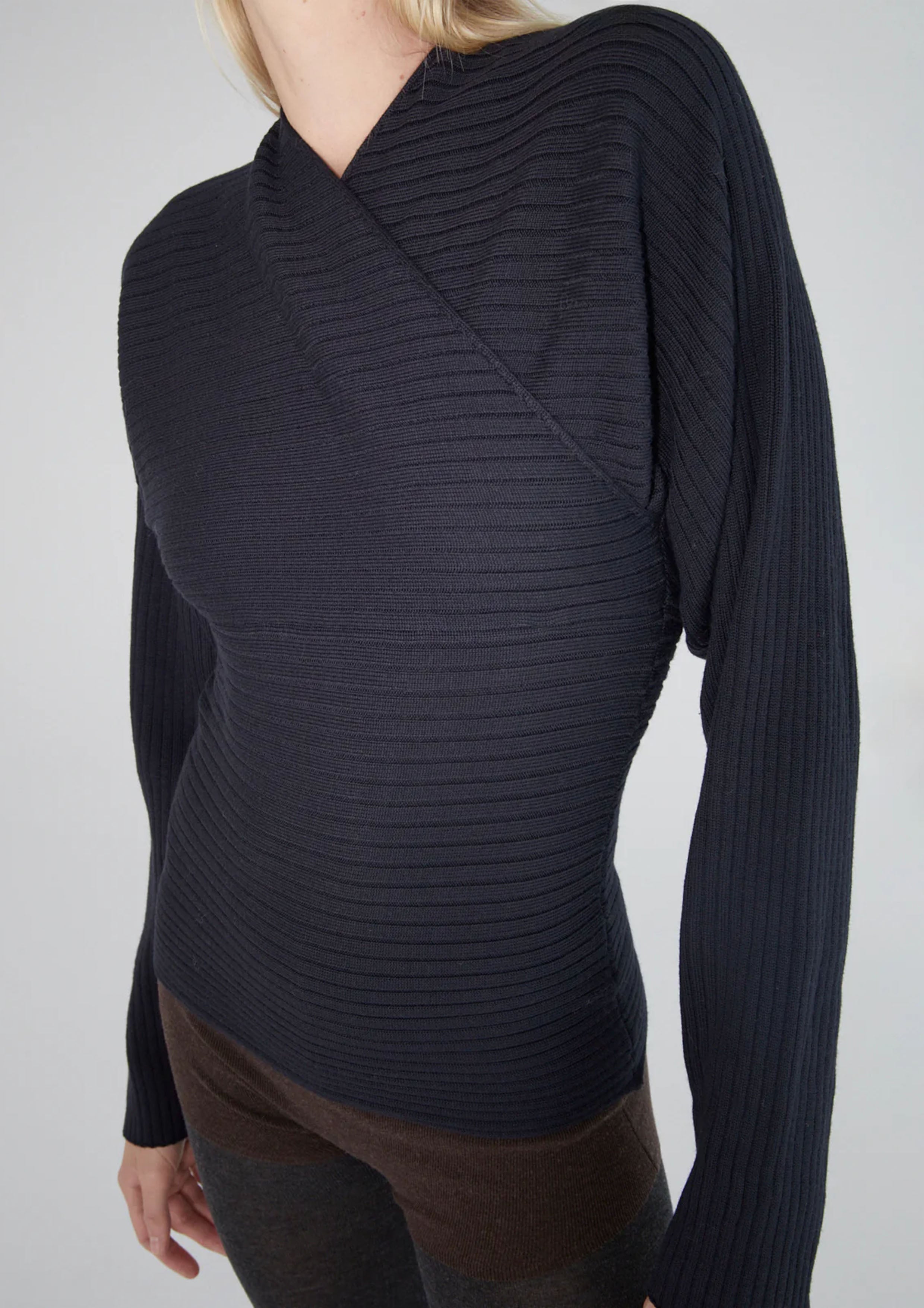 Sweater with horizontal ribbing and a crossover neckline at the chest. Fitted at the waist and hem, with wider sleeves and armholes. Made of warm, medium-weight wool.