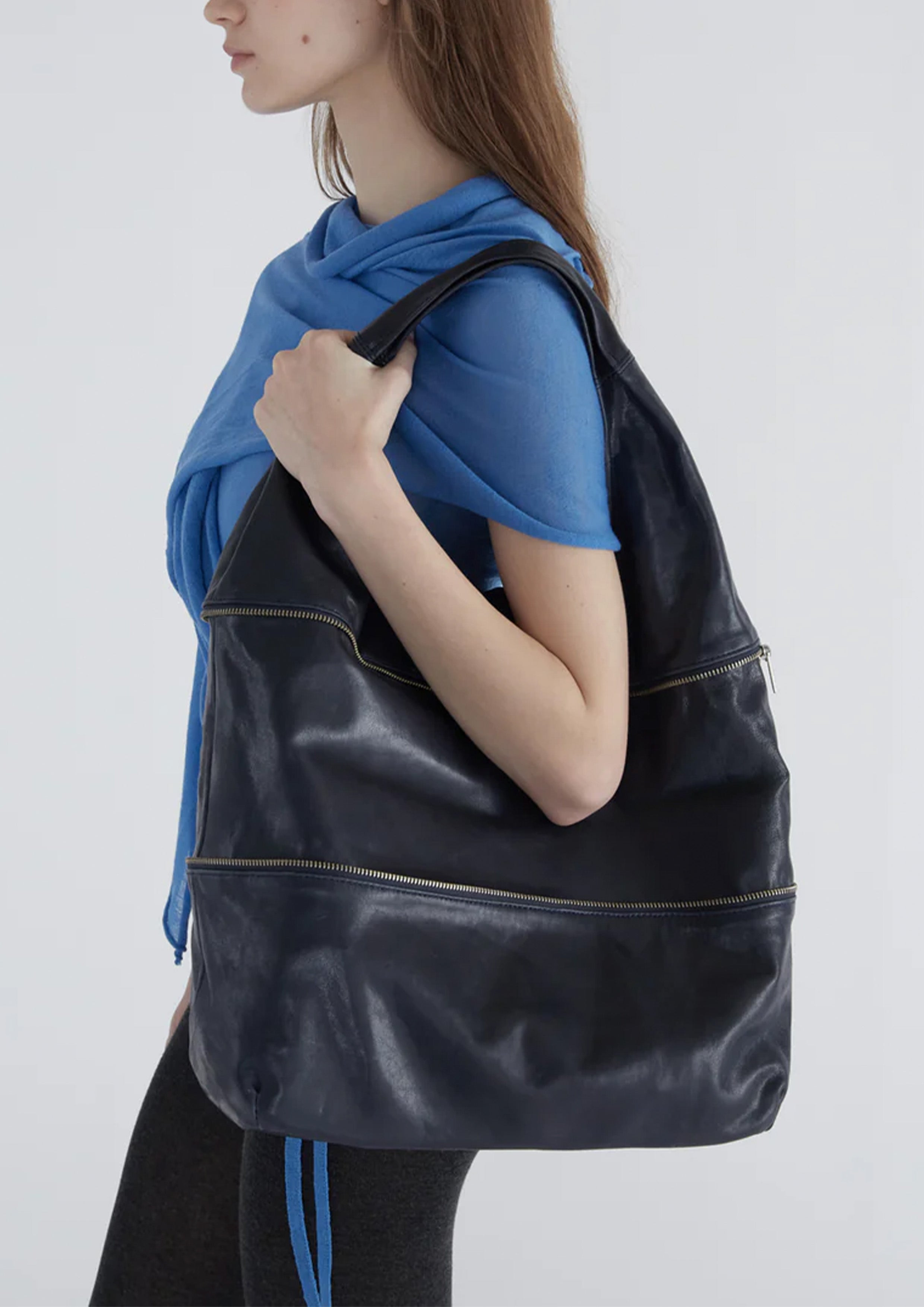 Bucket-style shoulder bag, unlined with an interior leather pocket. It can be converted into a smaller handbag by closing the visible zipper.