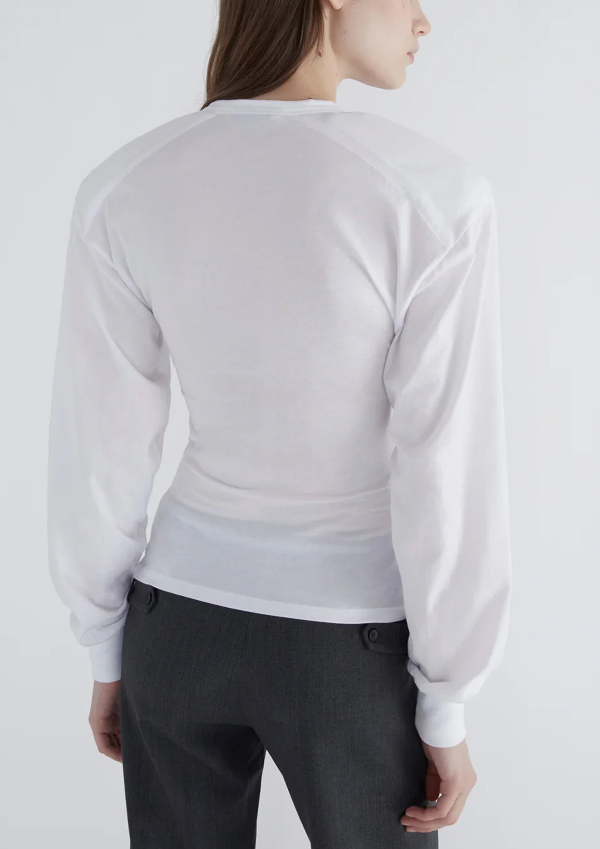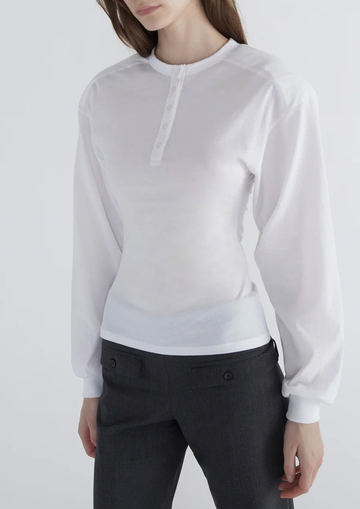 Long-sleeve top with a henley neckline, raglan sleeves, and removable shoulder pads. Made from soft, lightweight cotton. Fitted through the body with volume in the sleeves. Shoulder pads can be taken out for washing or to adjust the look.