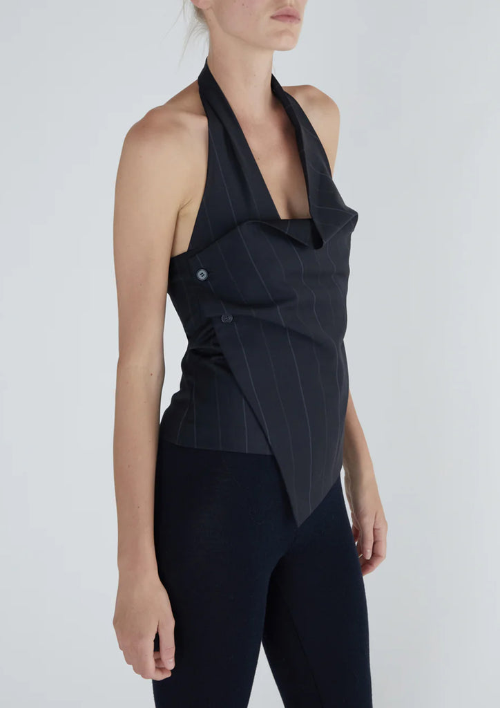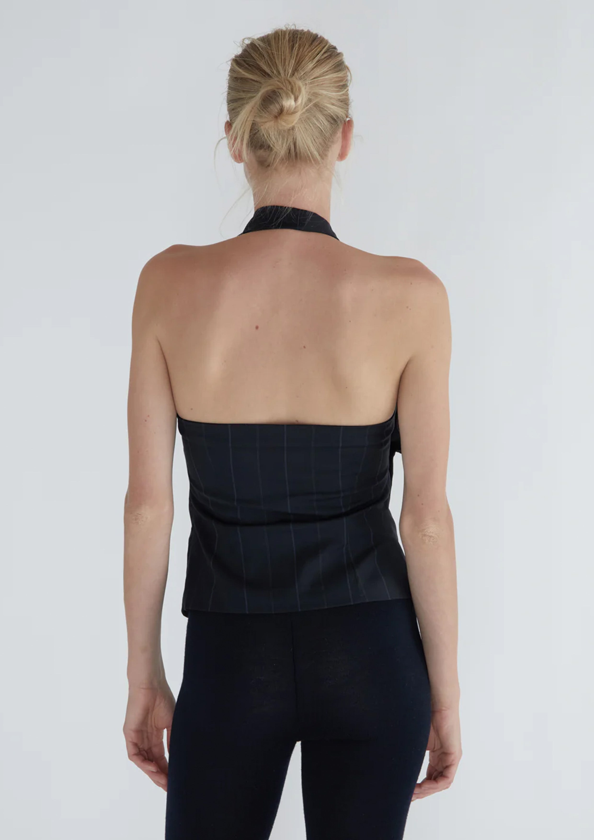 Halter top with a draped neckline made of striped suiting fabric.