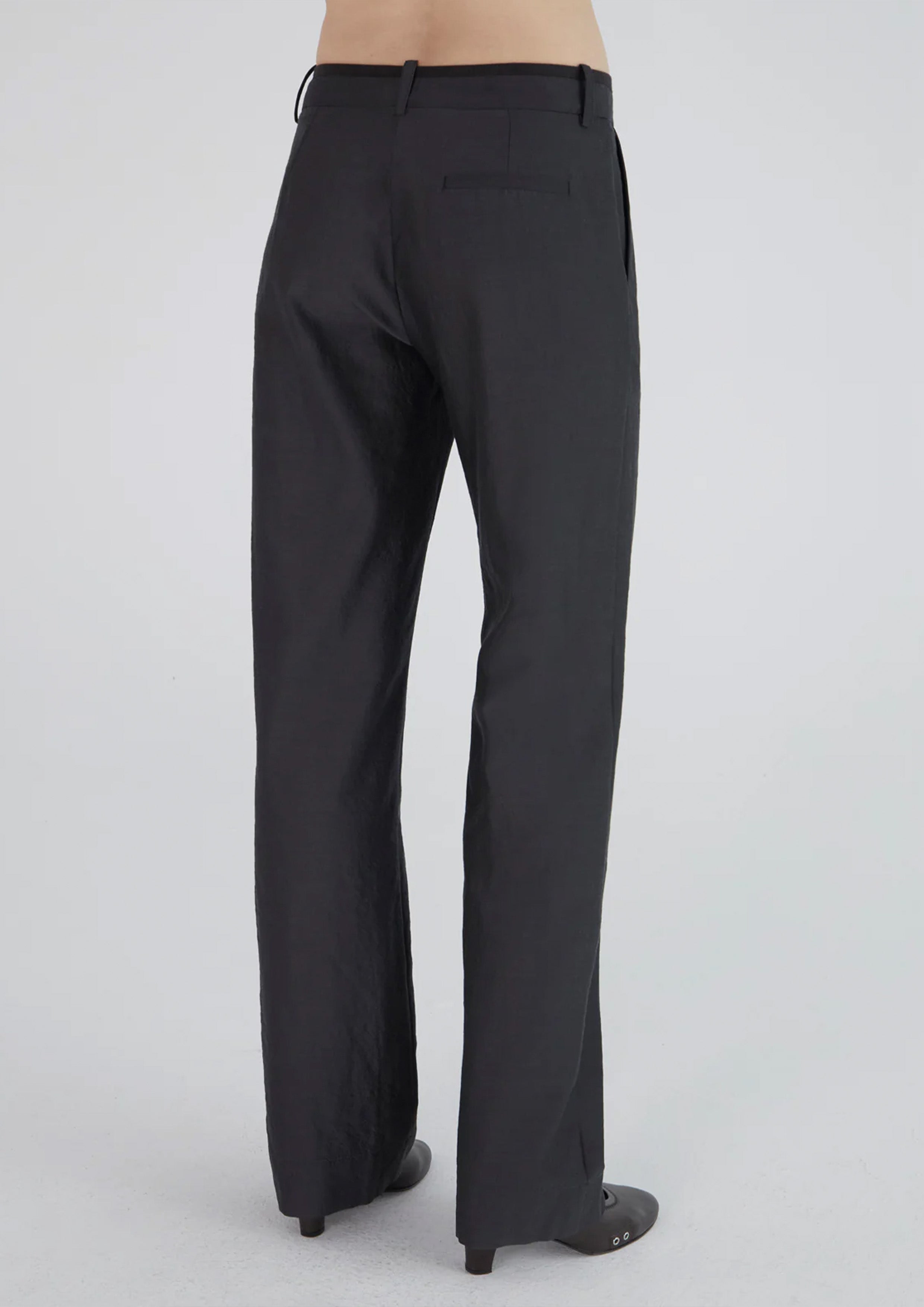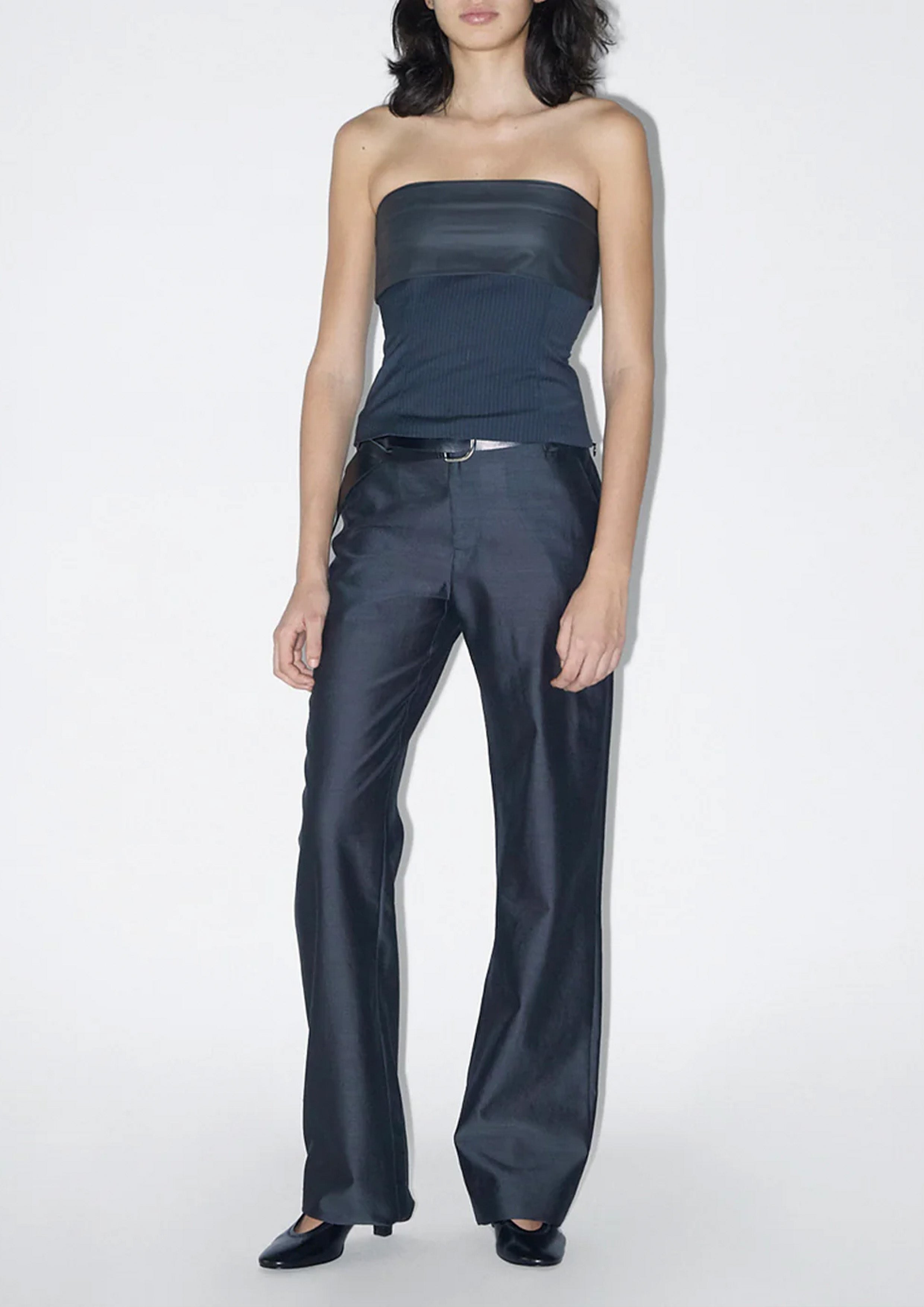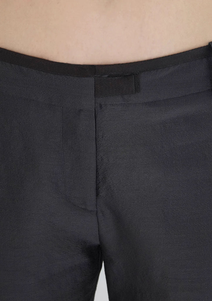 Straight fit wool and silk trousers with a grosgrain ribbon at the waist and a small tab with a snap button as a fly closure. Made of a wool and silk blend with a subtle sheen.