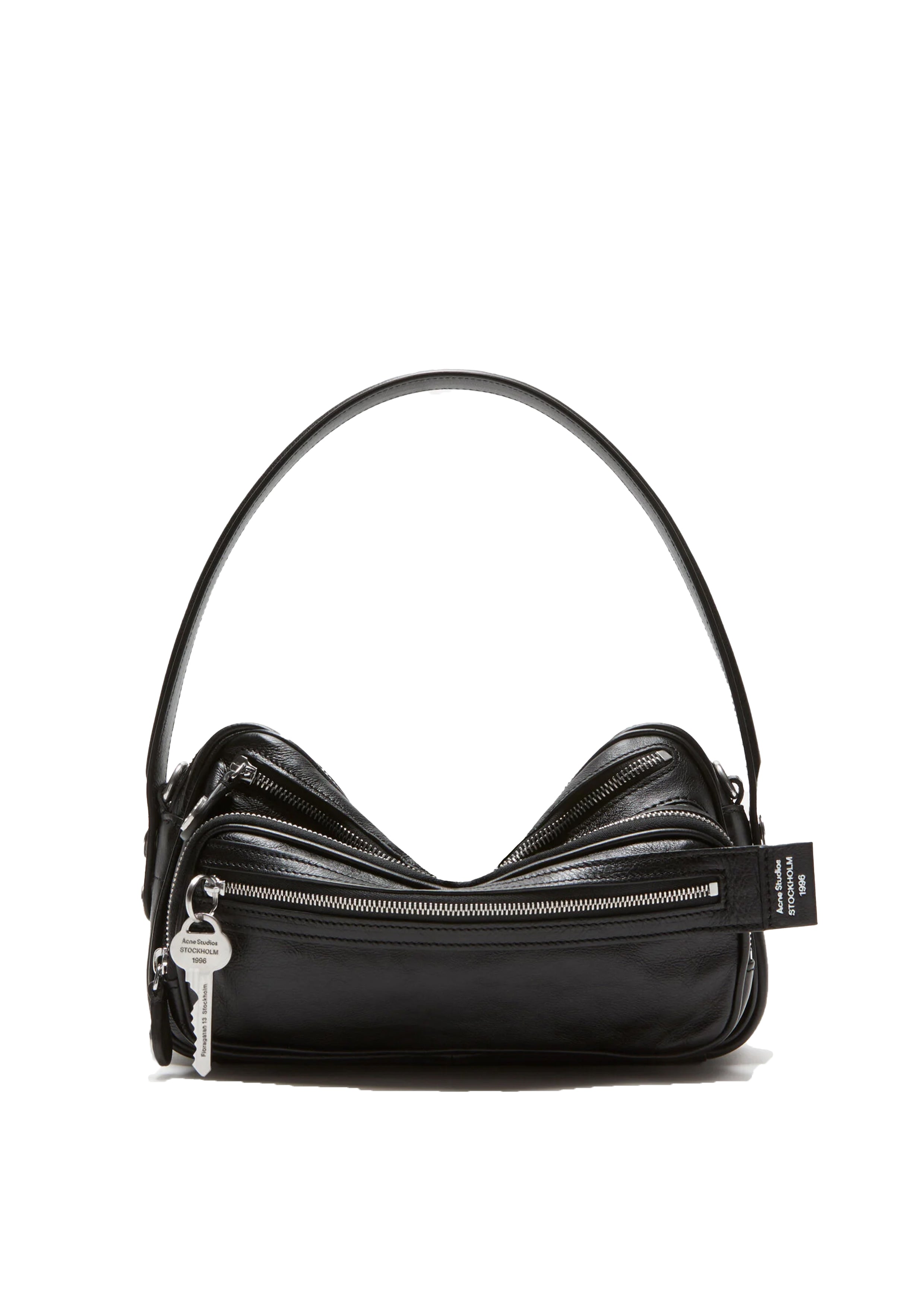 Camero Party bag crafted from soft leather with a multi-pocket design, zip compartments, a branded key charm, signature denim-style button logo, and the 1996 Acne Studios logo embossed in silver. Completed with silver metal hardware, a drop handle, and an adjustable crossbody strap.