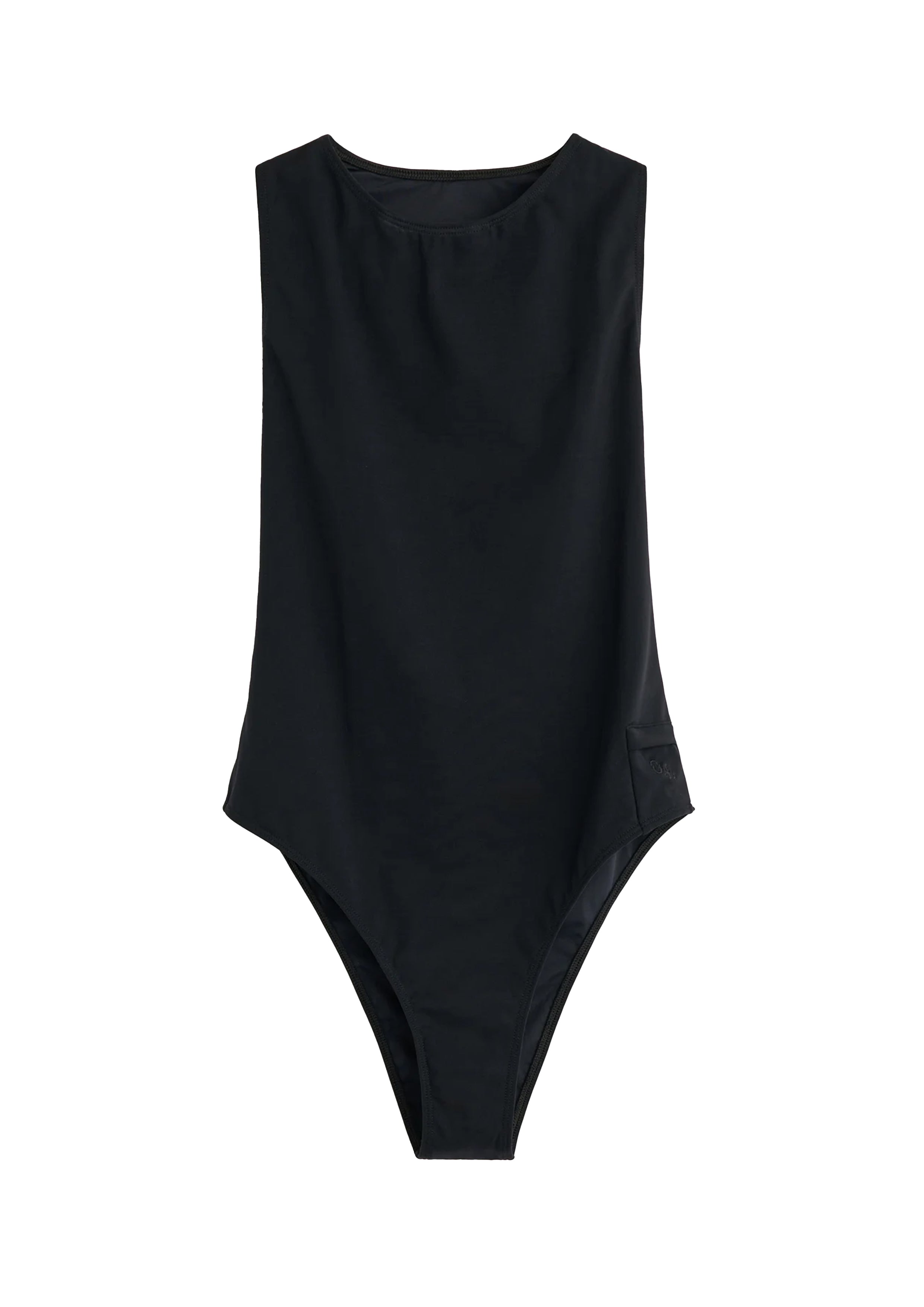 Our Loen Swimsuit in Carbon Black Leveled Jersey. Produced in Italian polyamide and elastane jersey fabric, the women's Loen Swimsuit has a slightly higher rise, a high neckline and an open back with an adjustable spaghetti strap, and is fully lined for a sleeker look.