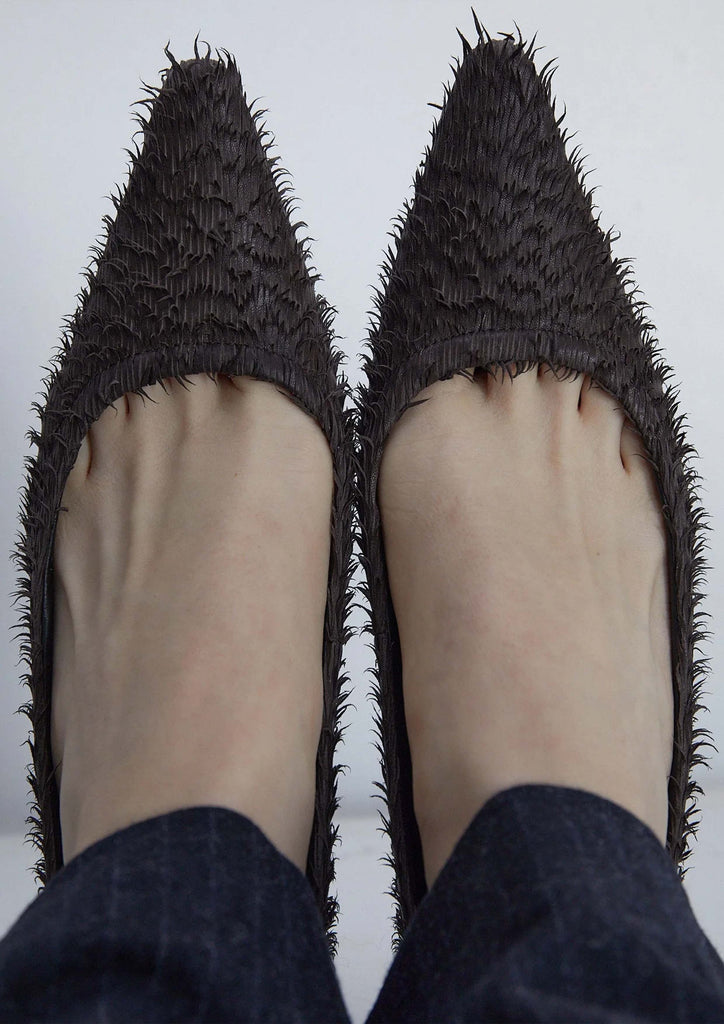 Made of slightly glossy leather, with surface cuts that create a natural “fluffy” texture. Variations in hair length are a typical characteristic of the leather due to its artisanal finishing process.