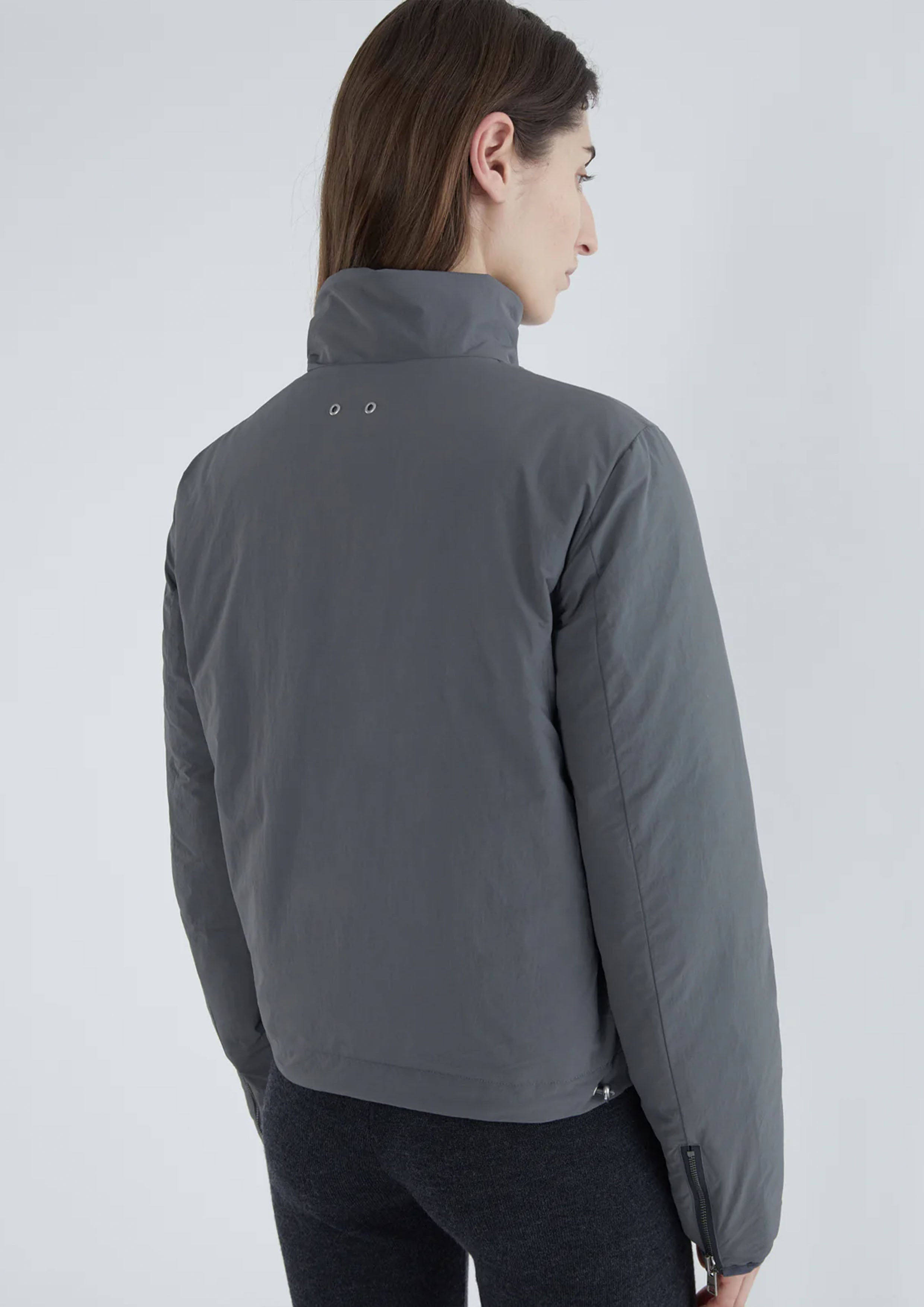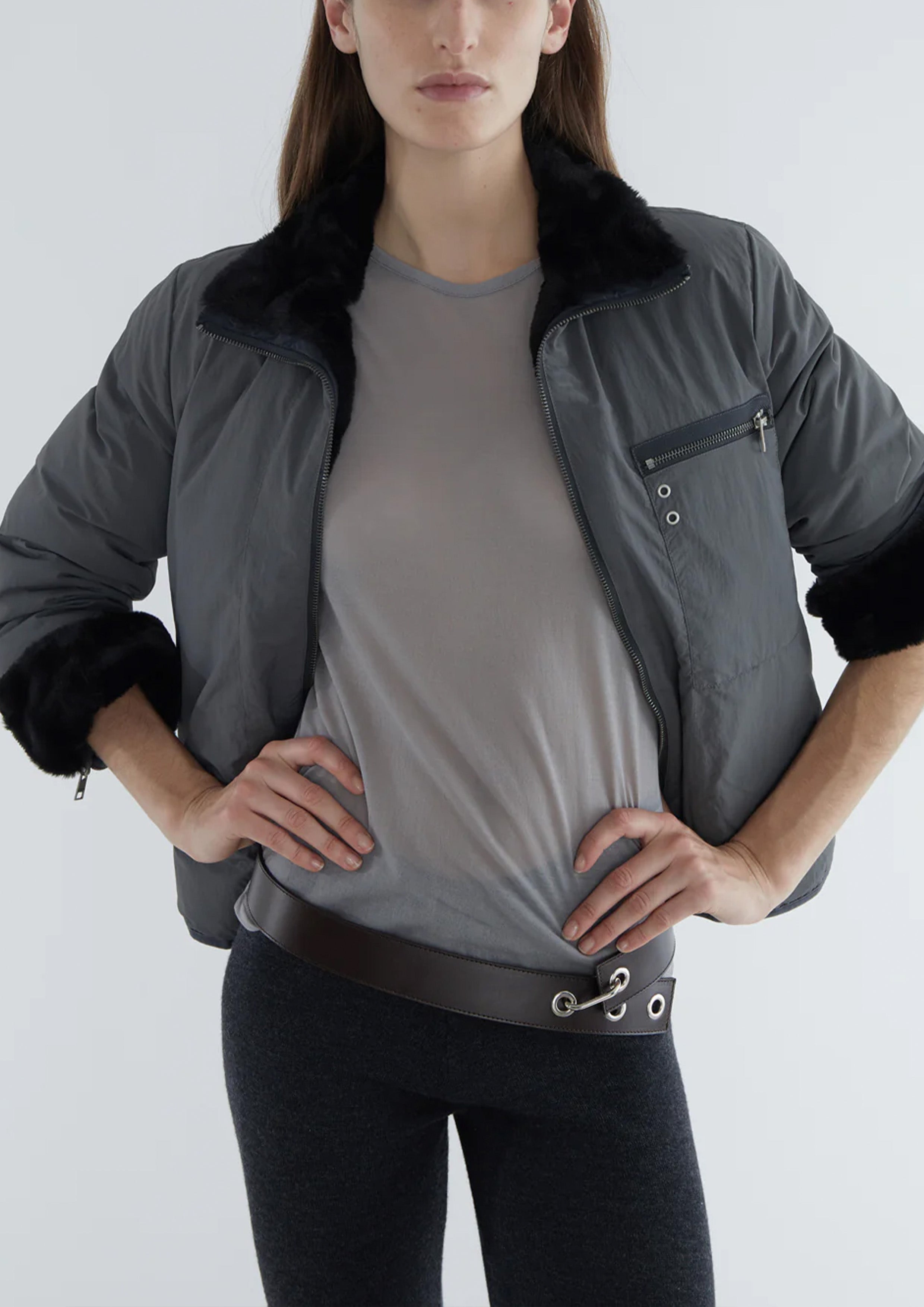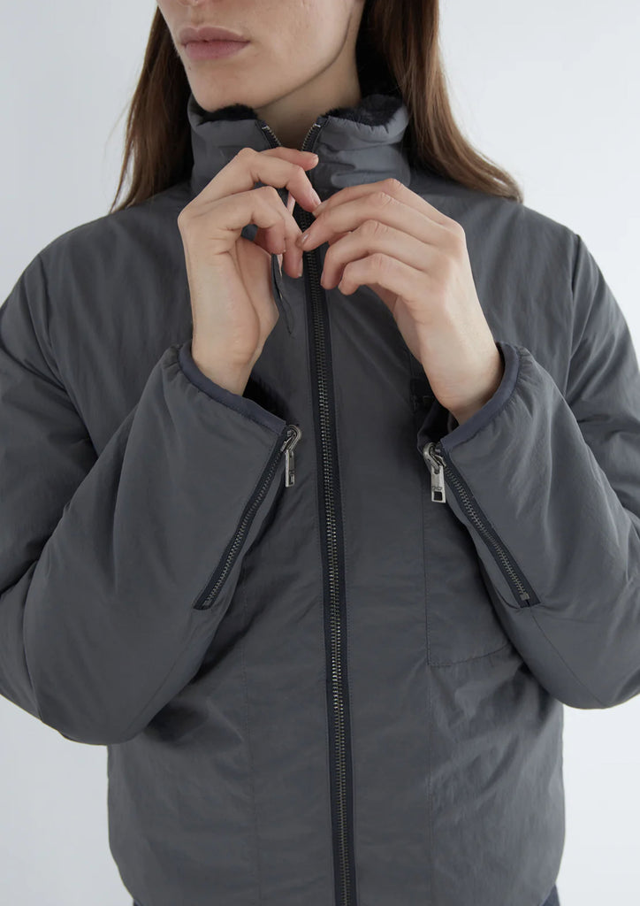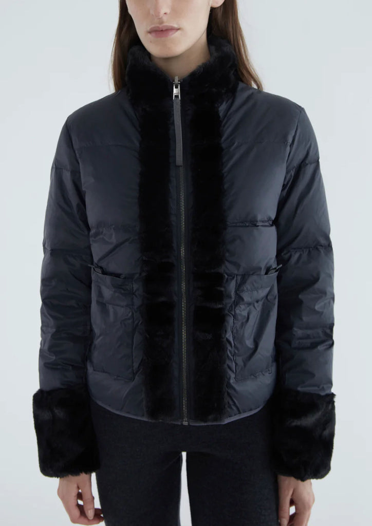 Reversible nylon puffer jacket with contrast furry collar and inner cuffs. It features underarm and outer pocket vents, adjustable hem and furry detail on the opening.