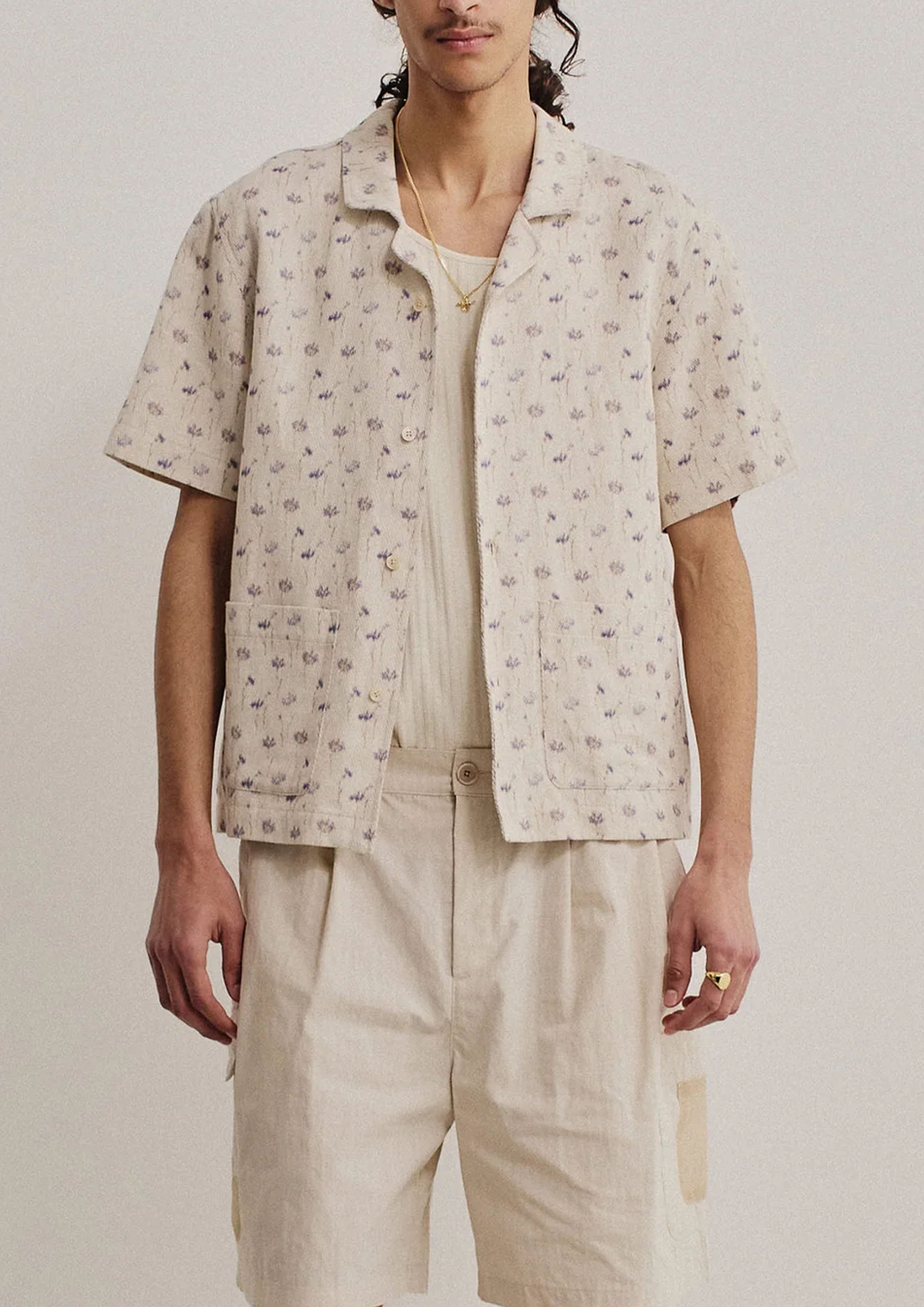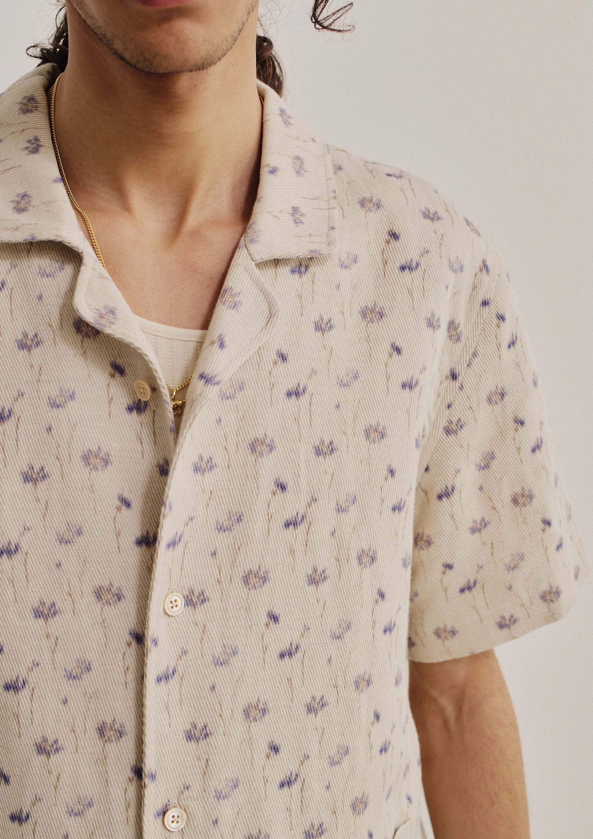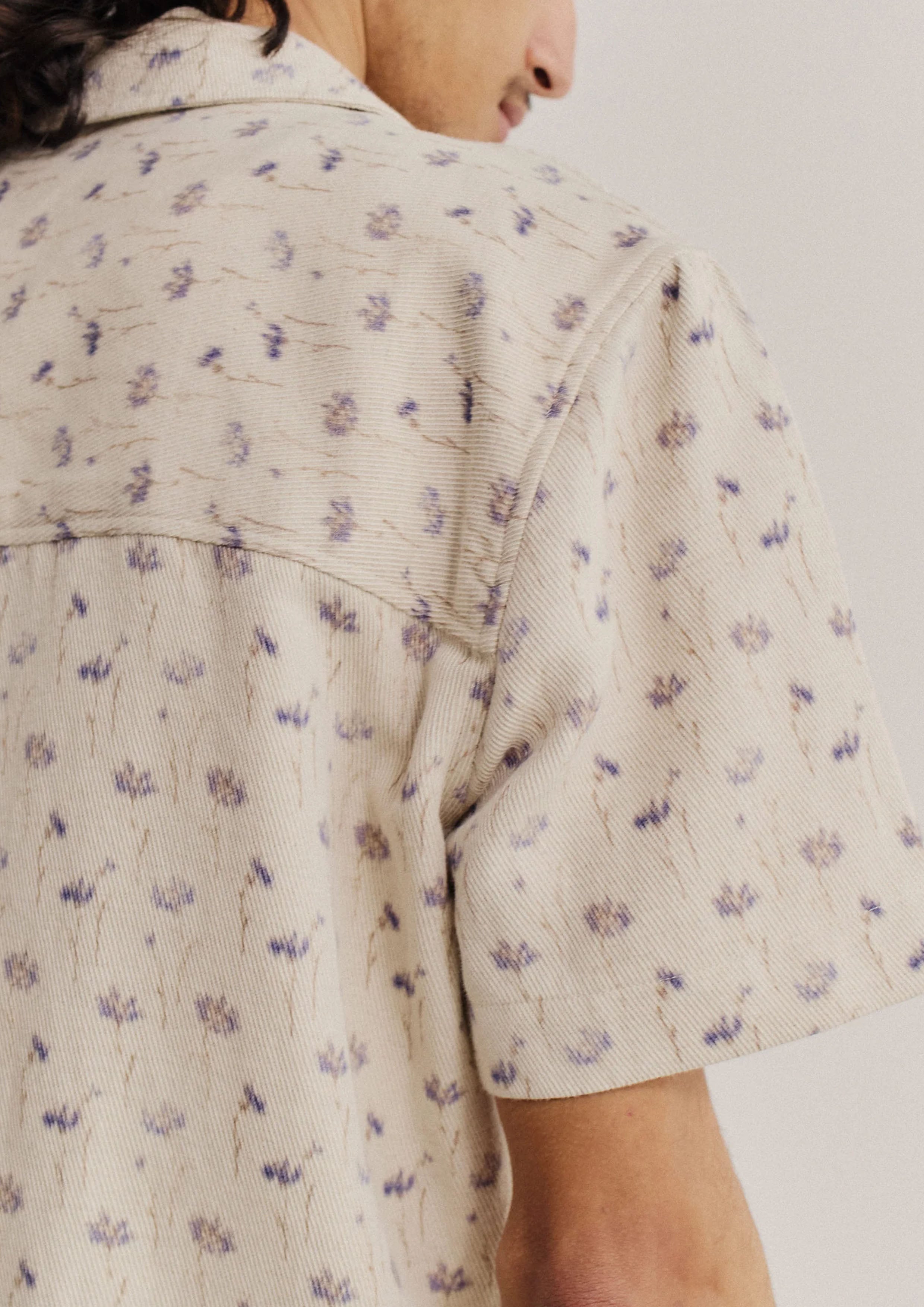 FABRIC: Cotton-linen blend twill with an ecru base, featuring a subtle floral print in muted lilac and brown tones with a soft, painterly touch. The visible diagonal twill lines add texture and depth, enhancing its artisanal character. Woven in Italy.