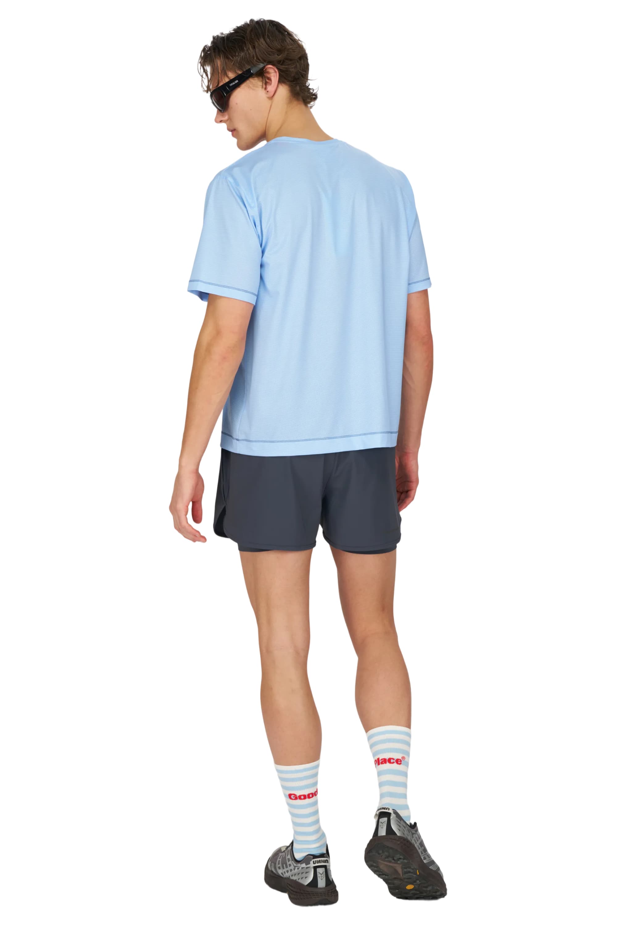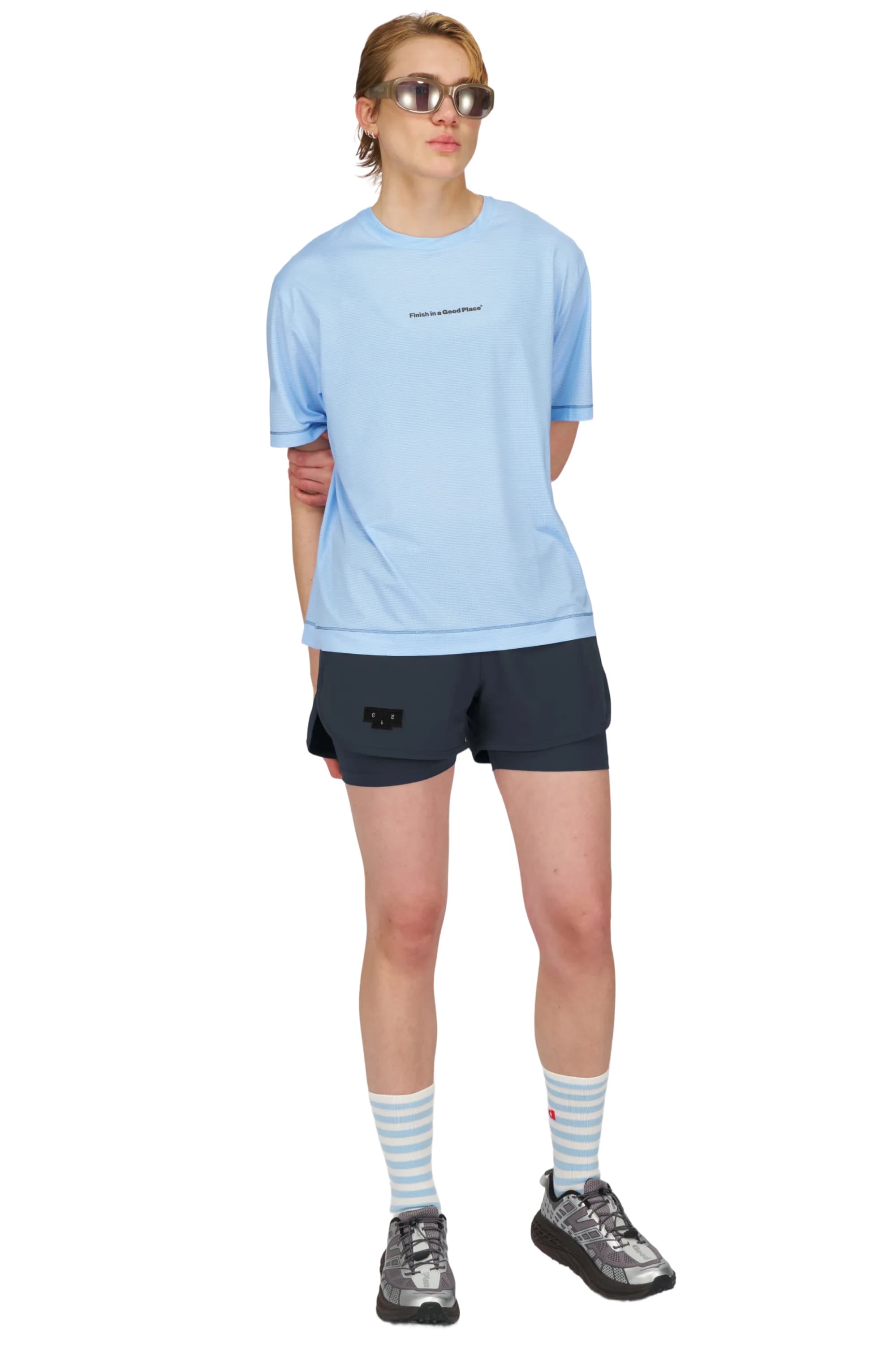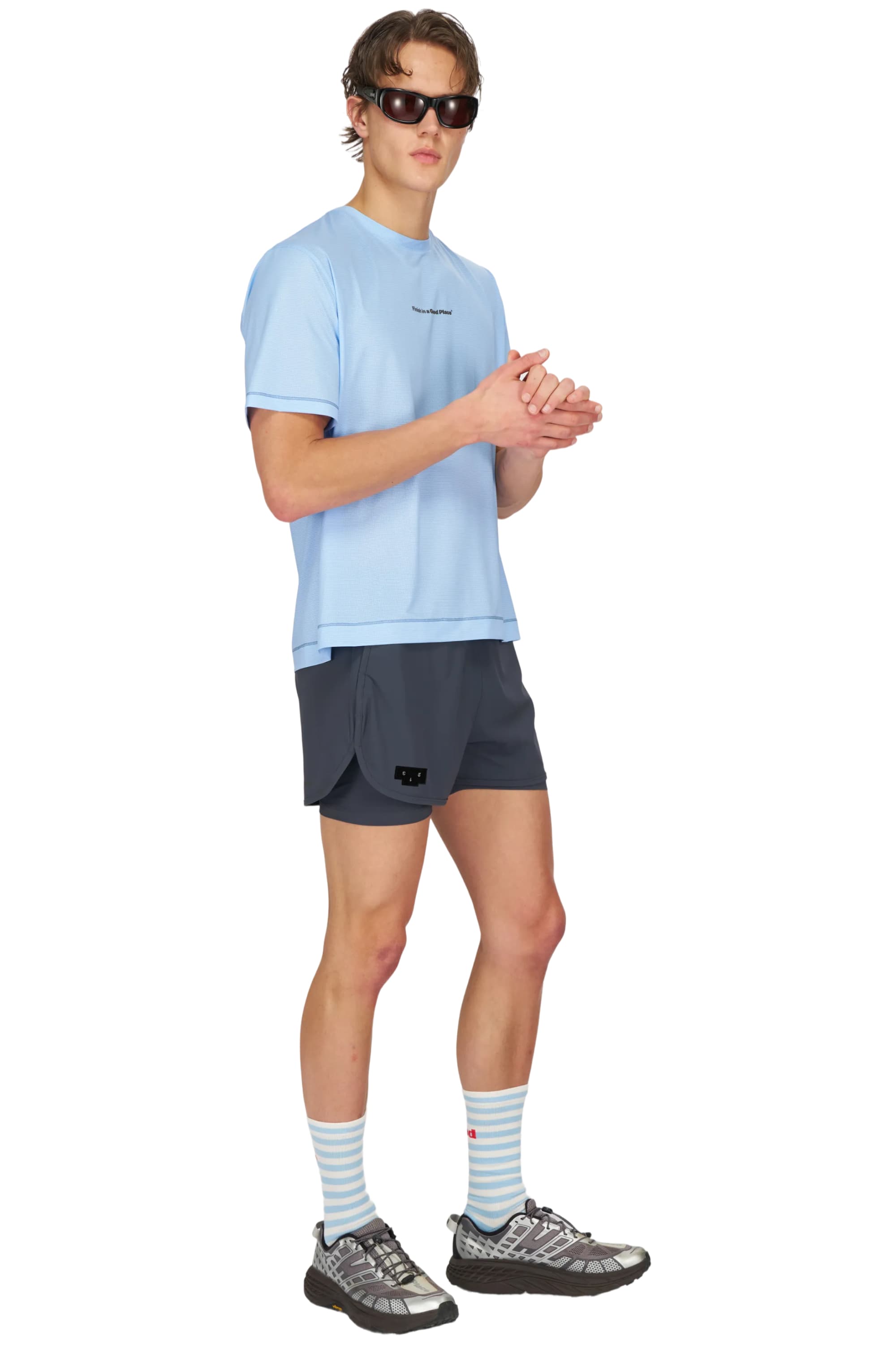 - Running shorts in Blue Grey, featuring an inner lining and side vents. The 3-inch Flow Shorts offer a soft stretch and are made from ECONYL® regenerated nylon. Podium Logo on the front and a reflective "Finish in a Good Place" slogan on the back. Includes one pocket in the inner lining and a hidden pocket at the back.